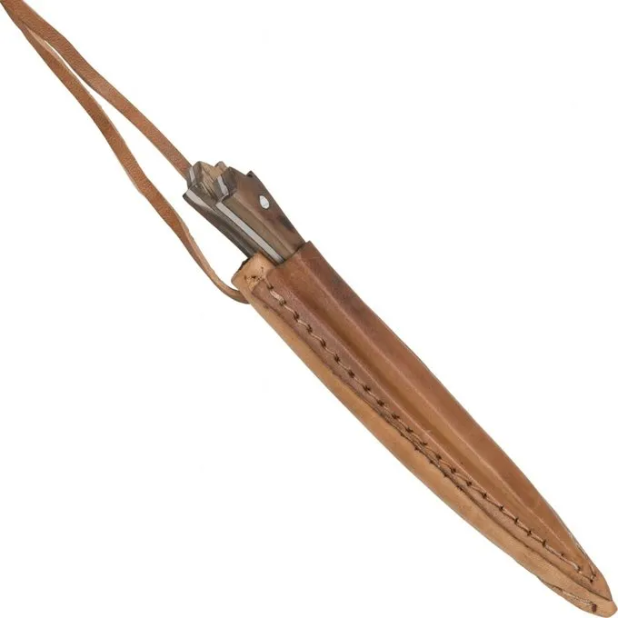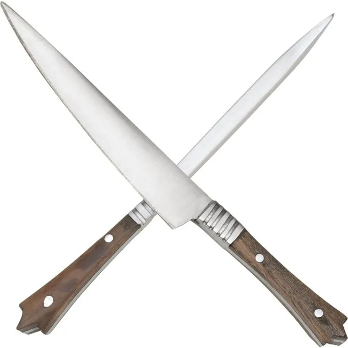 Dit bestekset is gebaseerd op 14de en 15de eeuwse originelen te zien in verluchte manuscripten en op geschilderde panelen. Deze mes en eetprikker hebben een houten handvat met nagels en een decoratief uiteinde. Tijdens de Middeleeuwen had een eetprikker de functie van een vork. De set wordt geleverd inclusief een leren hoes, deze heeft een lus zodat je hem handig aan de riem kunt hangen. Deze set is een perfect accessoire voor laatmiddeleeuws re-enactment.