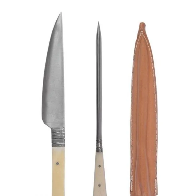 Dit 15de eeuwse bestekset bestaat uit een mes, vork en leren hoesje. De vork werd in de 15de eeuw door D’Medici geïntroduceerd. Bestek zoals dit wordt op verschillende Vlaamse schilderijen afgebeeld.