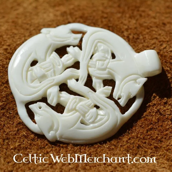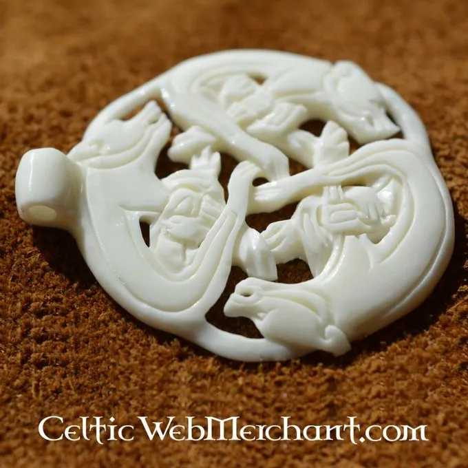 De hanger is geheel handgemaakt van been. Hij is 4,4 cm lang en 3,7 cm breed.