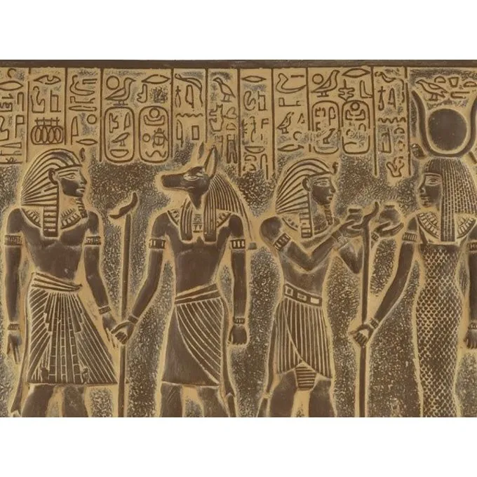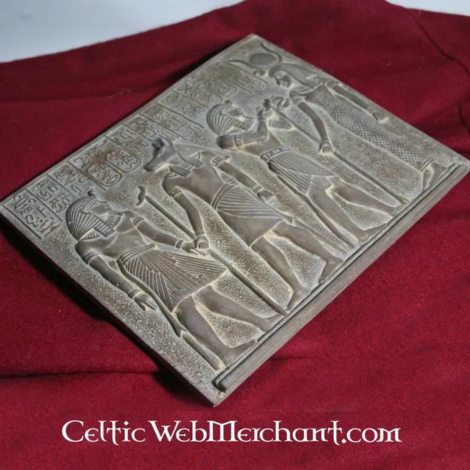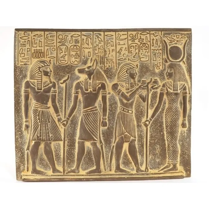 Van links naar rechts staan op dit reliëf Tut ankh Amun, Anubis, Ramses II en de godin Isis afgebeeld. Het reliëf is 26 x 22 cm groot en is gemaakt van gipsalbast. Aan de achterkant is het voorzien van een oog waarmee hij aan de muur kan worden gehangen.