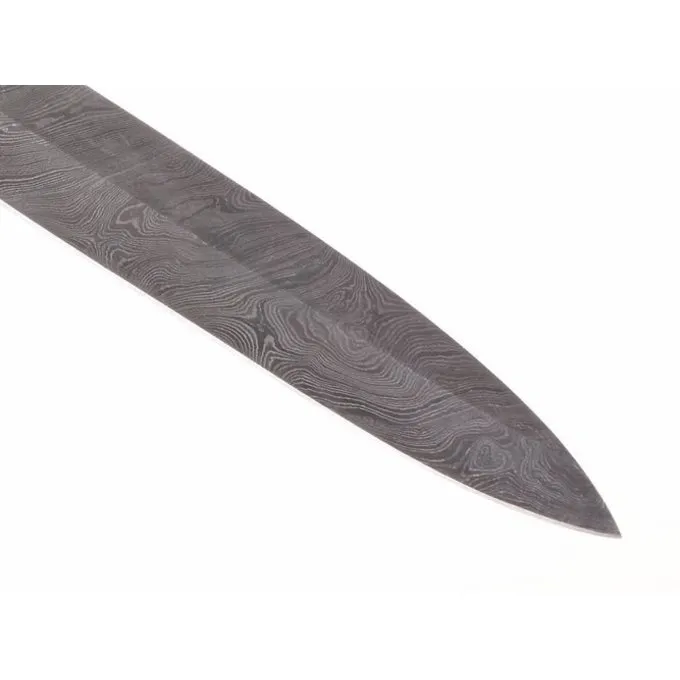 Materiaal: damasusstaal/ 256 lagen AISI 4340 en 15N20 staal / / Hardheid: 56-58 HRC / / Lengte: 42 cm / / Klinglengte: 30 cm / / max. klingbreedte: 3,8 cm / / Klingdikte rug: 4 mm / / Tang: 12 cm /