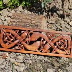 Deze mooie wanddecoratie is gemaakt in de Mammenstijl en is een Viking werpbijl. Deze stijl ontstond in de 2e helft van de 10e eeuw in de Vikingse nederzettingen, aan de oude door Vikingen gebruikte afbeeldingen werden toen ook afbeeldingen van planten toegevoegd.