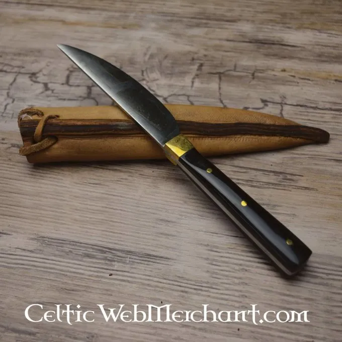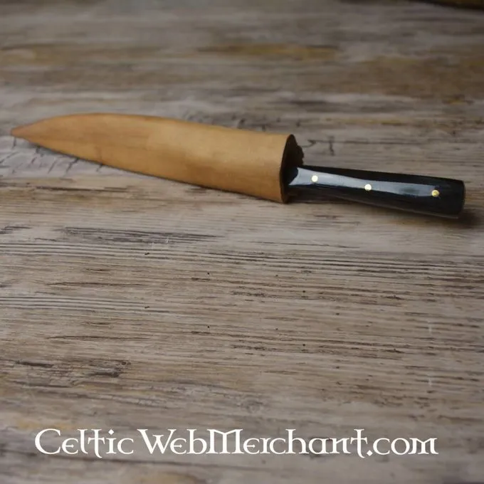 Dit eetmes is een replica van originelen die tussen de 15de en 16de eeuw overal in Europa werden gebruikt. Het mes is voorzien van een hoornen handvat, het lemmet is gemaakt van RVS. Dit mes wordt inclusief leren schede geleverd.