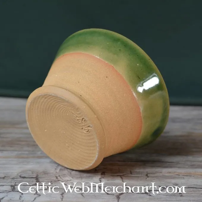 Deze kop geheel handgemaakt op de historische manier. Het is gemaakt van orchery klei, geglazuurd en heeft gedeeltelijk een flessengroene kleur. Hij is in de oven gebakken op 1.200°C. Kan in de wasmachine en geschikt voor koffie e.d. De hoogte is ca. 7 cm en diameter ca. 10 cm.