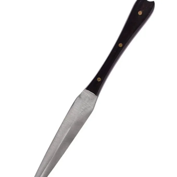 Deze set bestaat uit een tafelmes en een eetprikker met een prachtig hoornen handvat met klinknagels zoals bij de historische originelen die te zien zijn op verschillende schilderijen. Het mes is niet vlijmscherp, maar deze kan je zelf scherper maken met bijvoorbeeld een wetsteen (bij te bestellen in keuzemenu). Hij wordt geleverd inclusief een stevige leren hoes mes een leren koord, zodat je hem aan je riem kunt hangen. De set is gemaakt van roestvrij staal, waardoor hij niet zal roesten en snel schoon te maken is!