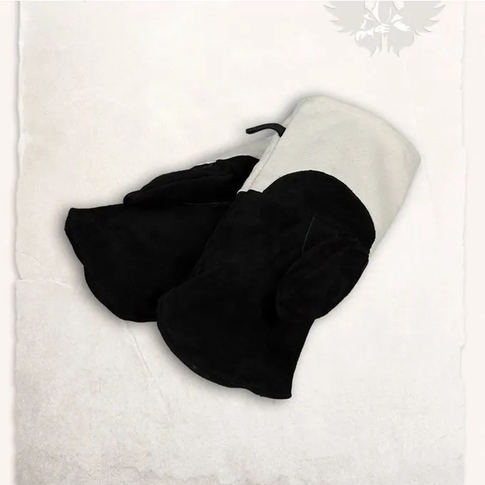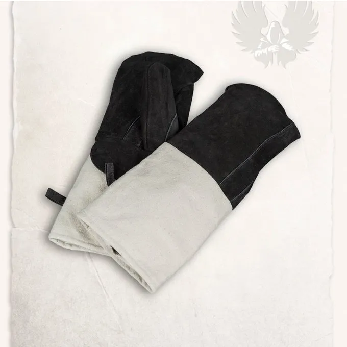 Koken op open vuur is een geweldige hobby, maar niet zonder gevaar. Als je je handen niet beschermt kan je brandwonden oplopen van het hete staal of van het vuur zelf. Deze handschoenen van Mytholon zijn een geweldige oplossing! De meeste keuken handschoenen en ovenwanten zijn in moderne stijl gemaakt en niet geschikt voor je LARP of reenactment personage. Met deze middeleeuwse keuken handschoenen kan je helemaal in stijl koken tijdens LARP en reenactment evenementen. Ze zijn gemaakt van suede met een katoenen onderkant. Het suede deel beschermt je hand tegen vlammen en hitte. Het stevige katoen beschermt de onderarmen tegen stoom en hete vonken. De ideale handschoenen voor de middeleeuwse keuken, koken op open vuur in de tuin en tijdens evenementen.