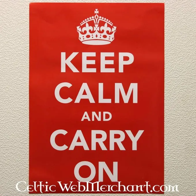 De slogan “Keep calm and carry on” werd gebruikt op een motiverende poster uit 1939, als voorbereiding op de Tweede Wereldoorlog. Hij was bedoeld om het moreel van de Britse bevolking op te krikken. Deze replicaposter is geprint op A3 papier.