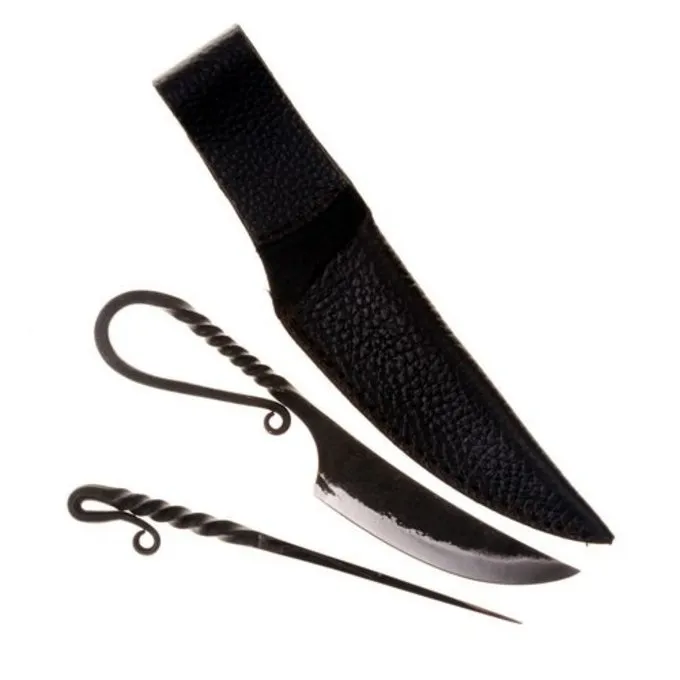 Dit handgemaakte bestekset bestaat uit een mes en eetprikker. Beide zijn gemaakt van koolstofstaal. Het mes is getemperd op een hardheid van 58-60 HRC.