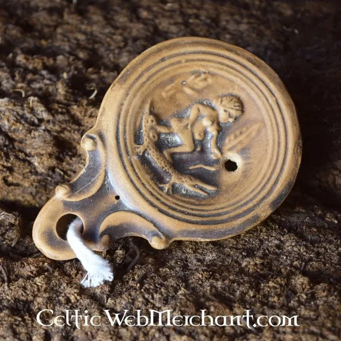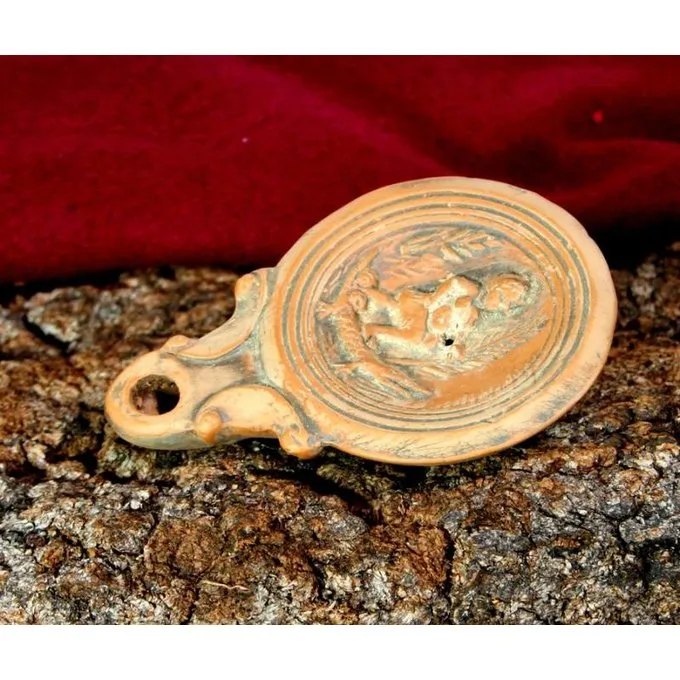 Deze olielamp is gemaakt naar een exemplaar uit de 1ste eeuw v.Chr. Hij bevat de afbeelding van van de Egyptische koningin Cleaopatra waarbij ze geslachts gemeenschap heeft met een krokodil. De krokodil stond voor de rivier de Nijl, en waarschijnlijk staat de geslachtsgemeenschap voor één zijn met. (Cleopatra koningin van de Nijl). Het origineel is waarschijnlijk van Egyptische makelij.