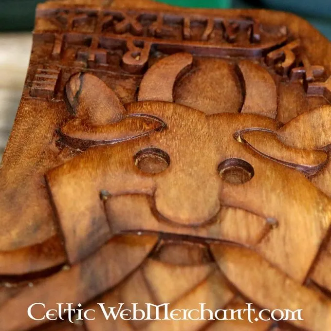 Het midden van deze decoratie toont een gestileerde Odin, de oppergod van de Vikingen. Langs de bovenrand staan runen gegraveerd.