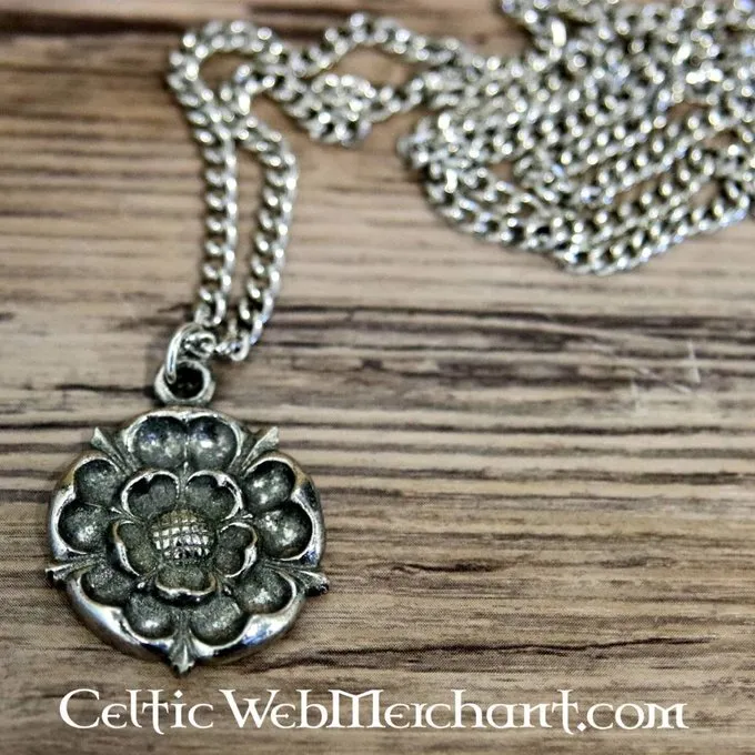 Deze hanger is gemaakt in de vorm van de roos van het huis Tudor, het koninklijk huis van Henry VIII en Elizabeth I van Engeland. Hij is gemaakt van tin en wordt inclusief zilveren ketting geleverd.