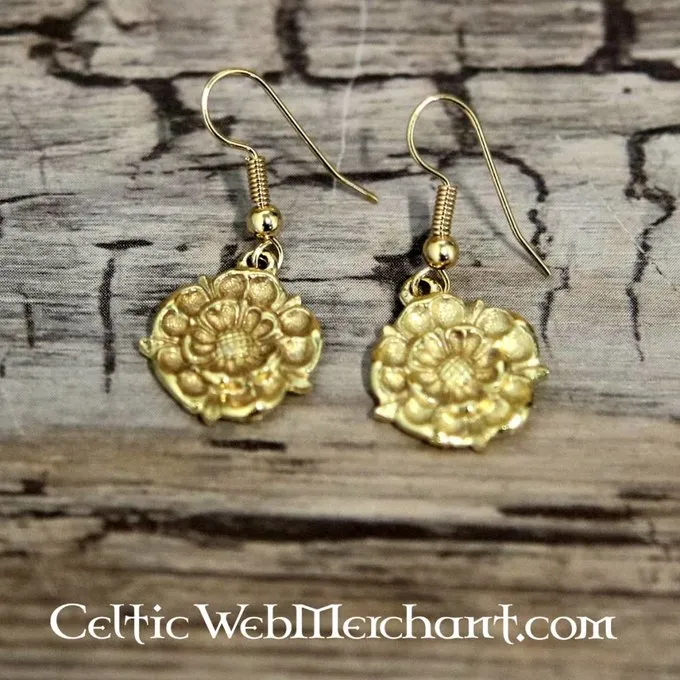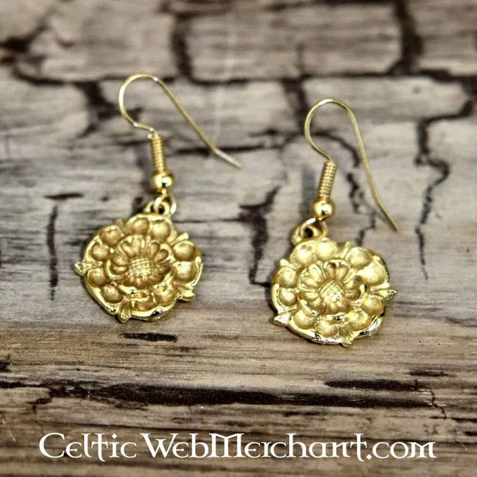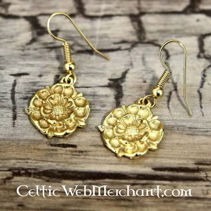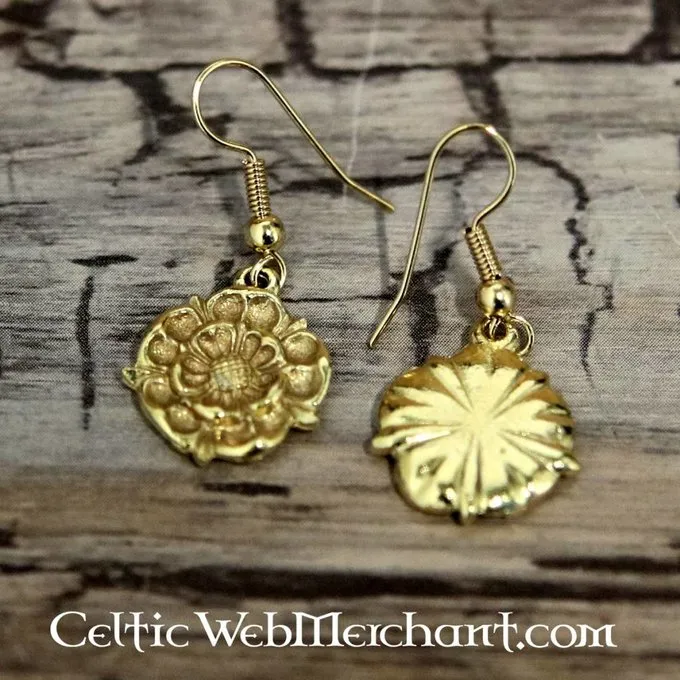 Deze oorbellen zijn gemaakt in de vorm van de roos van het huis Tudor, het koninklijk huis van Henry VIII en Elisabeth I. Ze zijn gemaakt van verguld tin en hebben vergulde, hypoallergene haakjes.