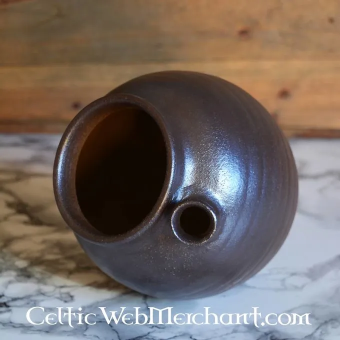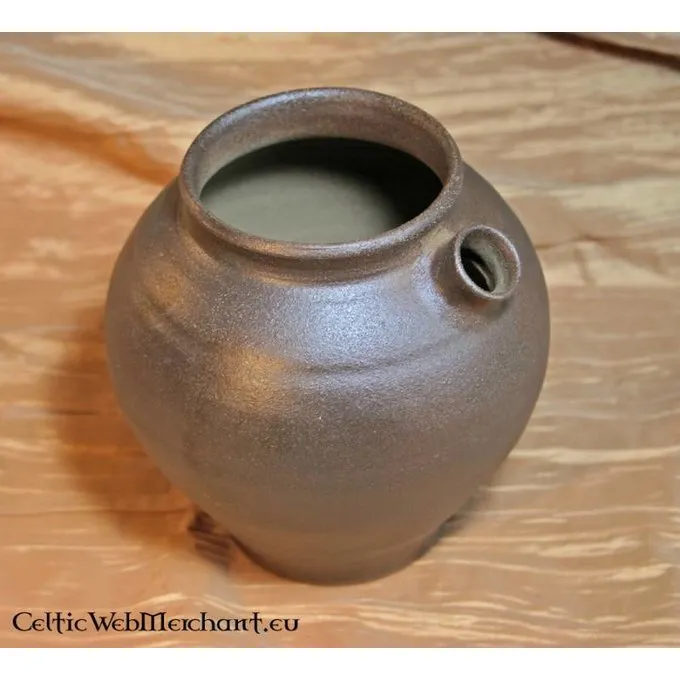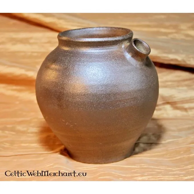Deze kan is gemaakt naar een exemplaar uit de 8ste-9de eeuw. Kannen zoals deze kwamen in geheel Noord-Europa voor. Hij is geheel handgemaakt van de klei uit het Rijngebied die rond de middeleeuwen werd verhandeld naar de Nederlanden, Duitsland en Italië.