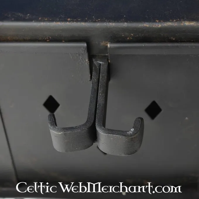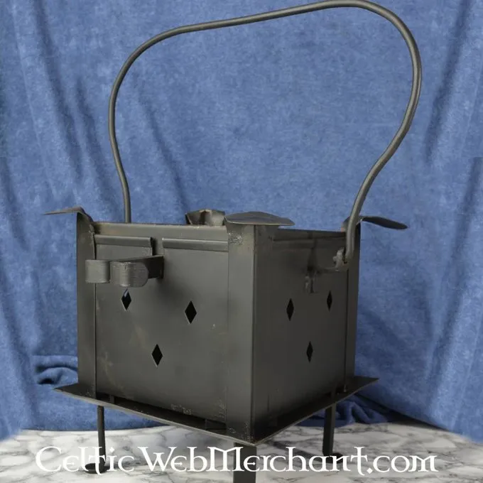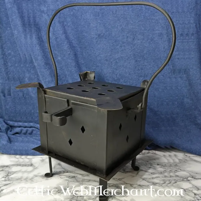 Dit stalen kooktoestel heeft zowel een voorschaal en grip. Hij staat op poten, waardoor hij geen schade toericht aan het grasveld, en gemakkelijk tijdens re-enactmentfestivals in steden kan worden gebruikt. Handig voor iedere kampkeuken en om ‘s avonds rond te zitten! Dit kookstel is handgesmeed van staal. De afmeting ca. 25 x 25 cm. Hoogte inclusief handvat ca. 48 cm en het gewicht ongeveer 5,3kg.